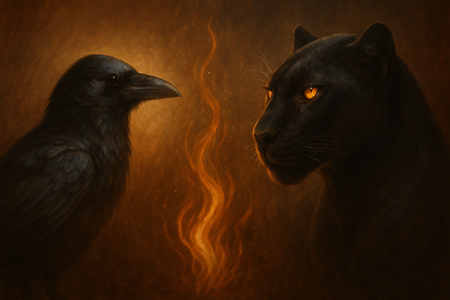 Crow + Panther ceremonial stories, Crow shadow unveiling, Panther embodiment, closing integration